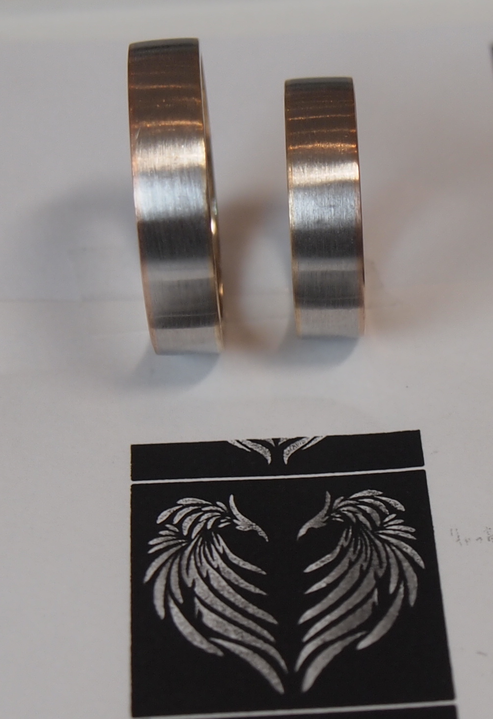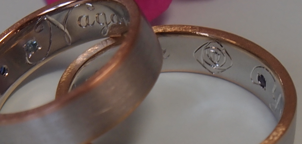 前に、お二人の誕生石をアレンジして、内側はたがねがはいりにくいでしが、手間暇かけて手彫させて頂くつもりです。