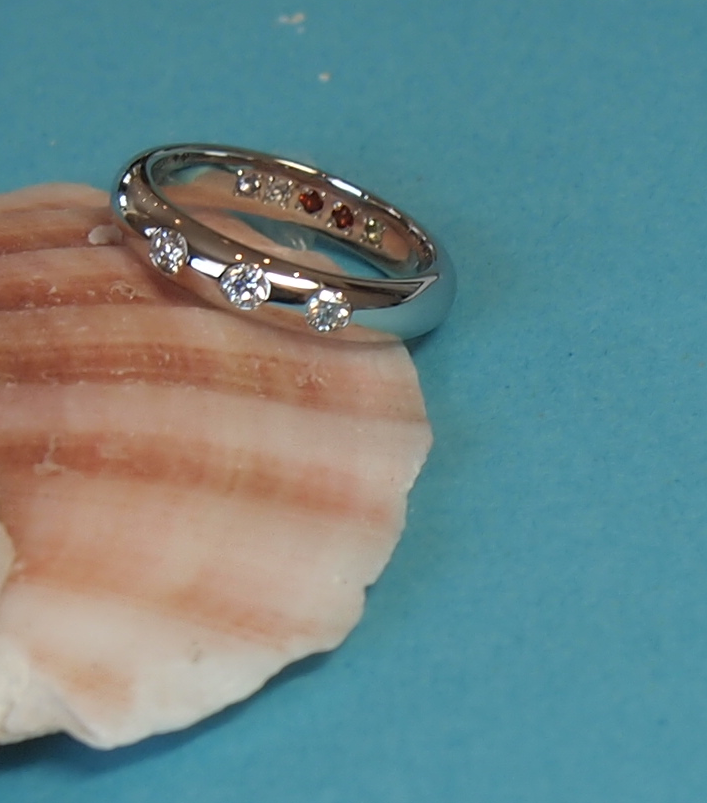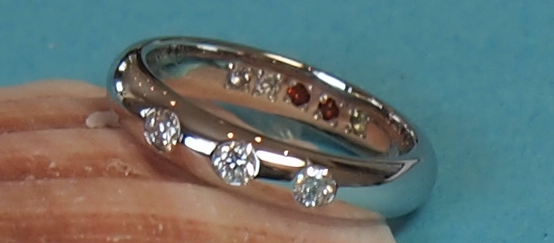 アニバーサリーリングの表側には綺麗なダイヤモンドを3個入れて、そのリングの内側には、