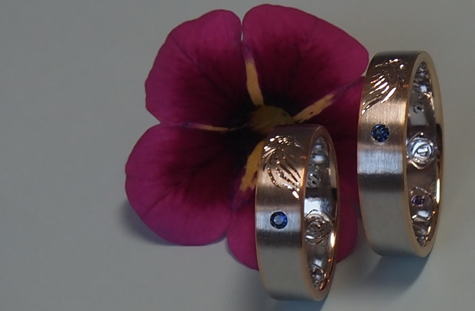の絵柄を丁寧に手彫して、ロイヤルブルーの綺麗なサファイアを入れた、フル・オーダーの結婚指輪になりましたよ。