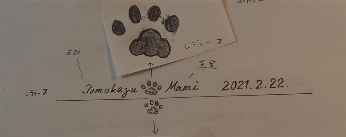 お二人それぞれの愛するペットたちの足に墨をつけて押して、その実物の肉球の