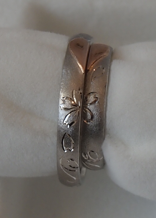 やお好きな花のモチーフを手彫して、お二人の結婚指輪を合わせることによって