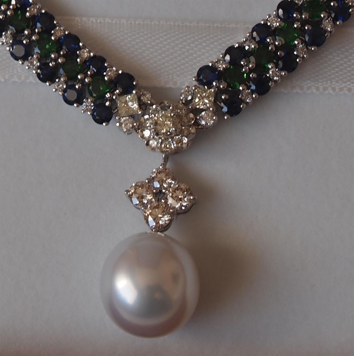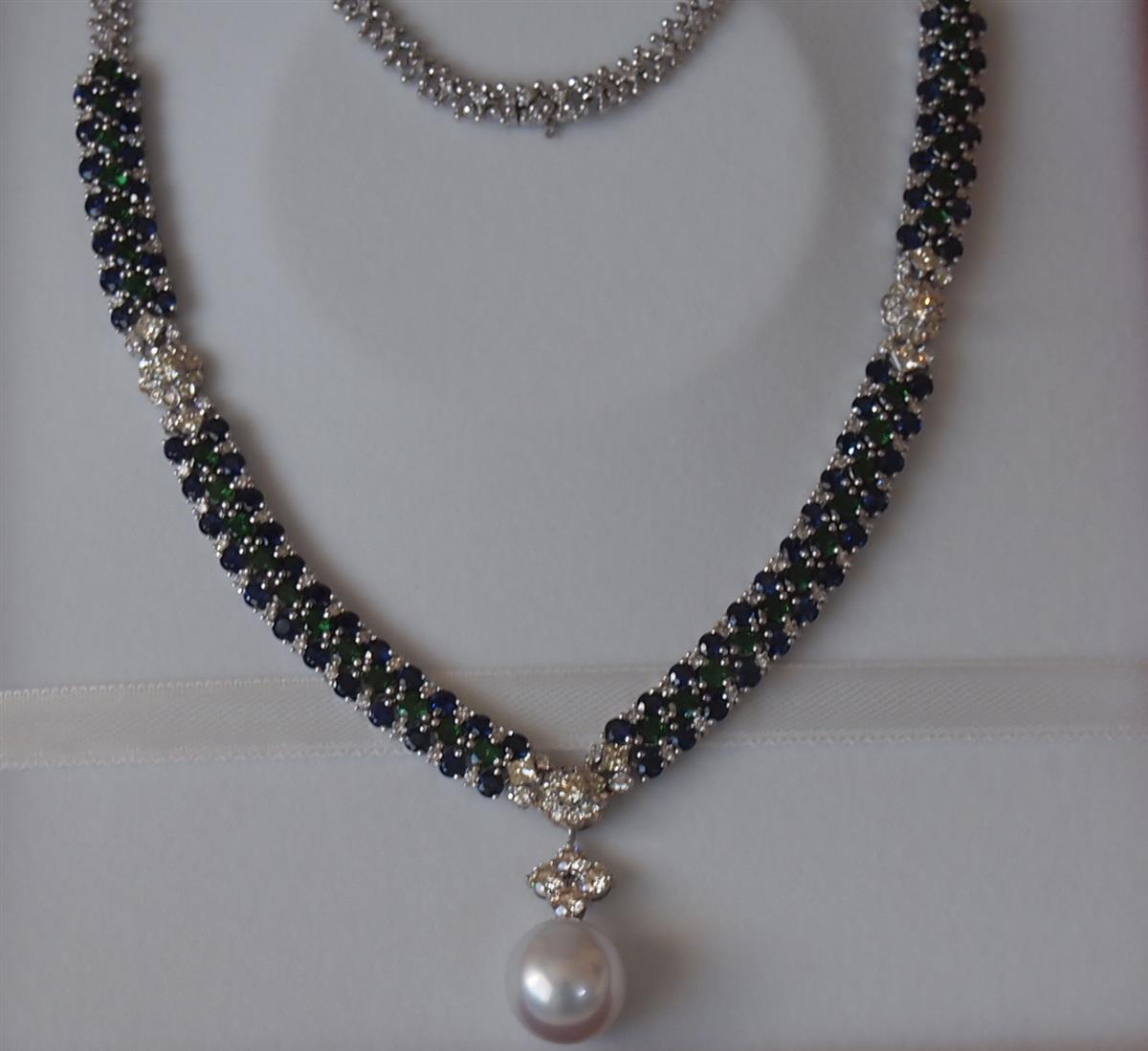 豪華なダイヤモンドとサファイアとエメラルドのネックレスを、娘さんの結婚式