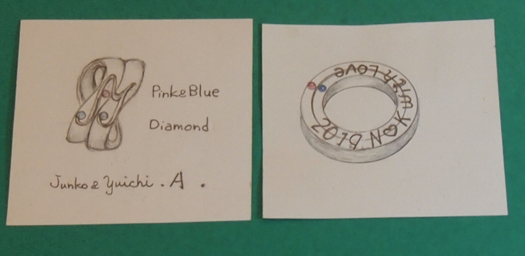 先ほど来店され、完成品を見て頂き彼女のデザインによる世界に一つ二人だけの