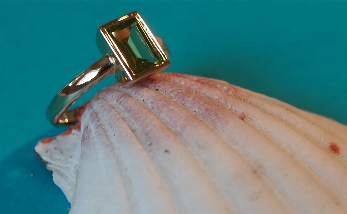 スクエアのペリドットをフクリン留めで綺麗なラインで留めて、リングも太すぎ