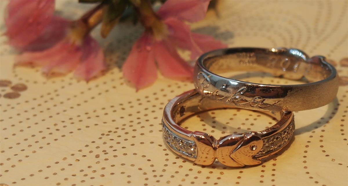 お互いの名前を筆記体で波のように手彫した世界に一つ二人だけの結婚指輪にな