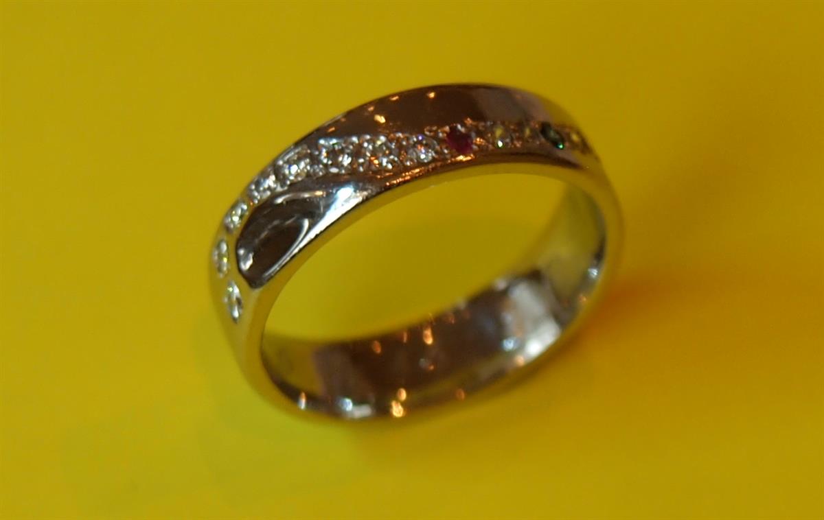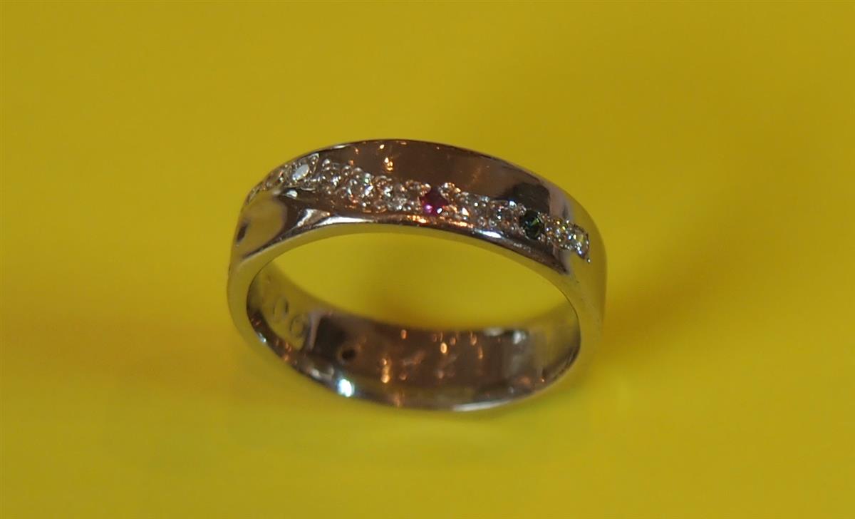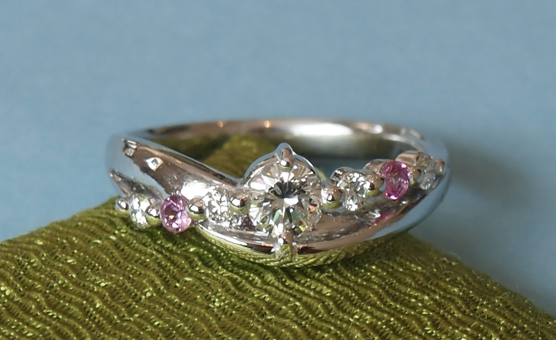 ける時などにもさりげなくはめれるように横にもダイヤと彼女の誕生石を入れて