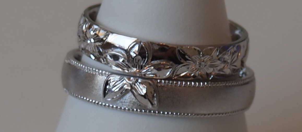 こちらのお二人は彼女はプルメリアの花柄で全周を手彫したデザインで、彼は