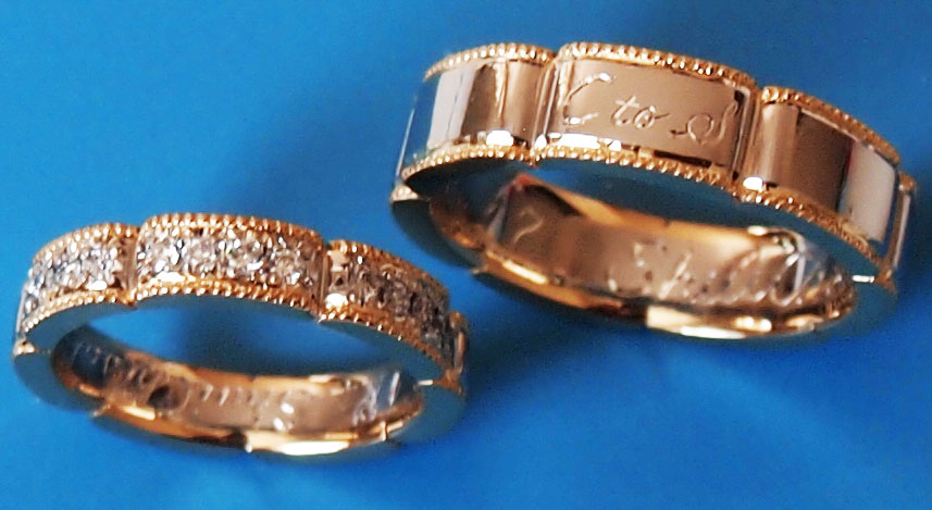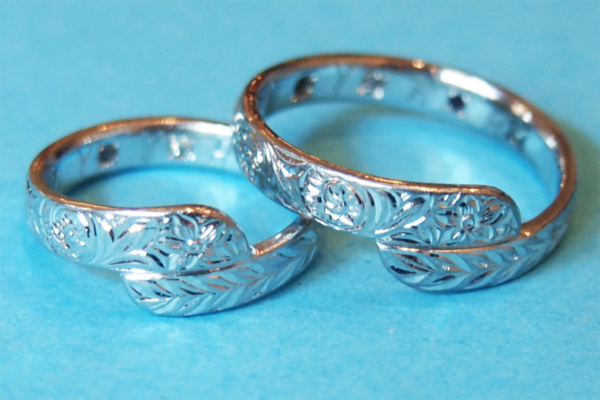 リングの表にも裏にも、お二人のこだわりをデザインしてご家族やご友人に思い切り自慢してください。それが当店の宣伝費の削減になり、それをお二人に還元させていただきます。